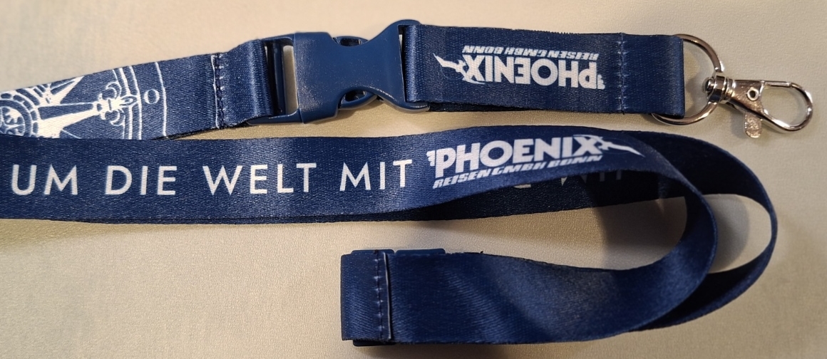 Wer möchte, kann sich weiterhin damit seine Bordkarte um den Hals hängen oder bei Ausflügen den Audio-Guide dran befestigen - auch in dunkelblau.