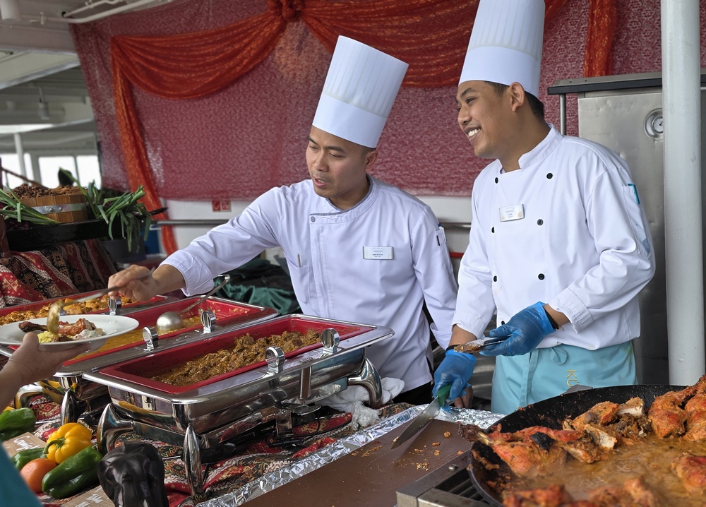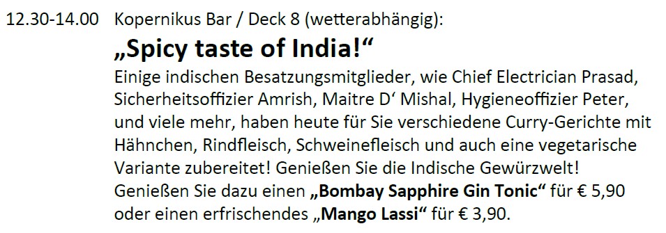 Stattdessen hat der Kreuzfahrtdirektor in seiner Sendung „auf ein Wort“, die zu Anfang einer jeder Kreuzfahrtetappe im Bordfernsehen läuft, an die Reisenden appelliert, im Lido die Plätze mit Rücksicht auf die Warteschlange freizugeben, wenn die Mahlzeit beendet sei.
