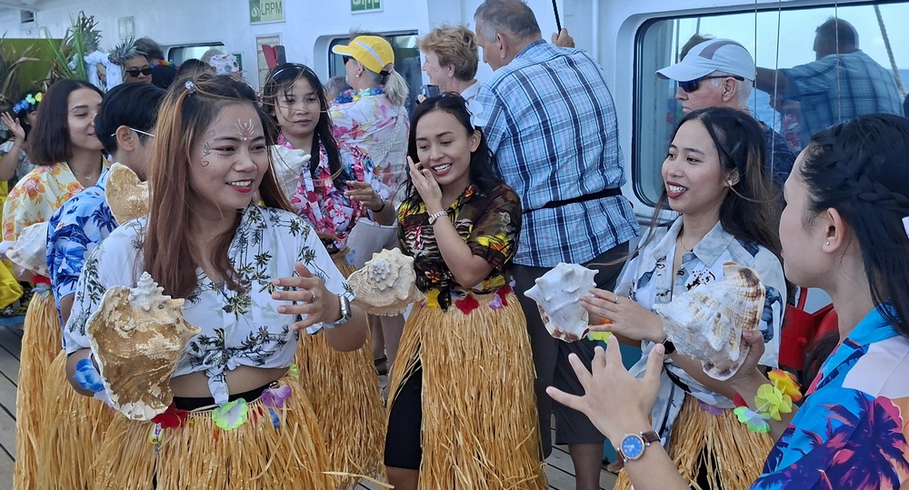Um 11:00 stand die Äquatortaufe auf dem Programm. Da wir das Ritual kennen, trabte Doris zur Kopernikus Bar, dem Ort des besagten Spektakulums, lediglich mit dem Auftrag versehen, ein paar Fotos zu schießen und vor allem zu berichten, ob auch der Kapitän getauft wurde oder nicht.