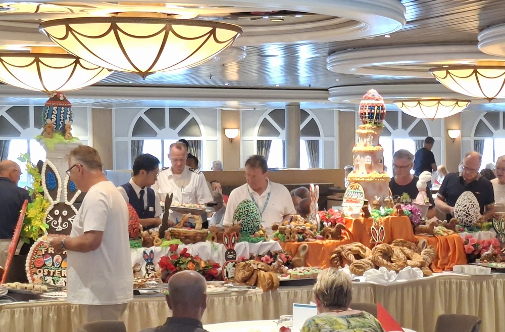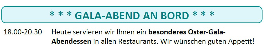 Der heutige Seetag gepaart mit Ostern wurde für die sogenannte Mittelgala genutzt, gekürt durch ein „besonderes Oster-Gala-Abendessen“.