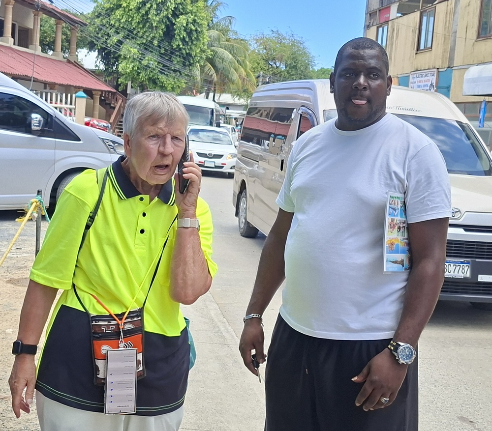 Wir waren pünktlich, aber unser Abholer war nicht da. Es tummelten sich rund um den Hafenausgang noch einige Anbieter und versuchten ihre Touren an den Mann/an die Frau zu bringen. Einer von Ihnen erklärte uns, dass das Fahrzeug von Daniel Johnson gerade weggefahren sei, aber er könne uns die gleiche Tour zum gleichen Preis anbieten, ohne dass der Schelm wissen konnte, welches Paket wir gebucht hatten.