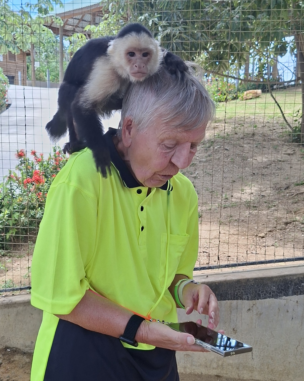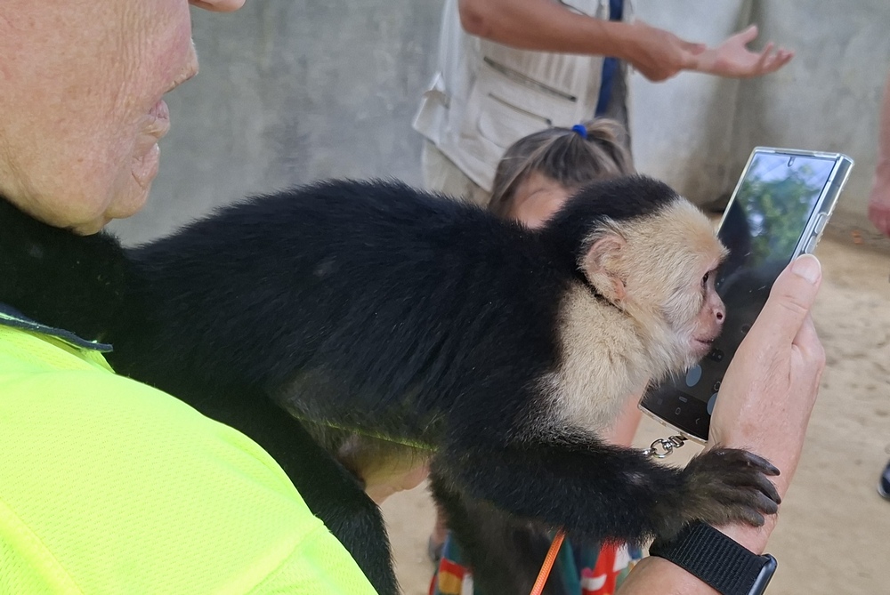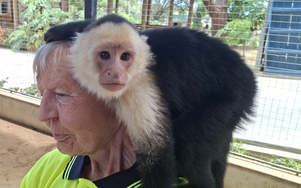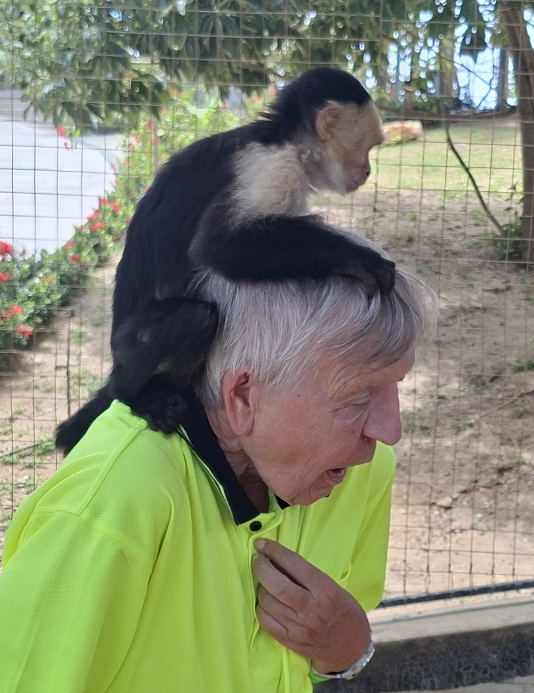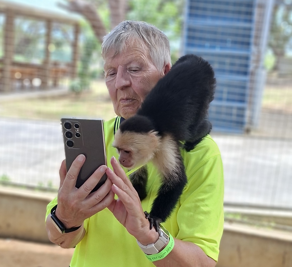 Der Hit waren die beiden Kapuzineräffchen, die mittlerweile an die Menschen gewöhnt waren. Bevor wir in das Gehege durften, mussten wir alle beweglichen Teile wie etwa Brille und Kappe ablegen, weil die Affen diese gerne stibitzen und unerreichbar weit oben im Käfig deponieren.