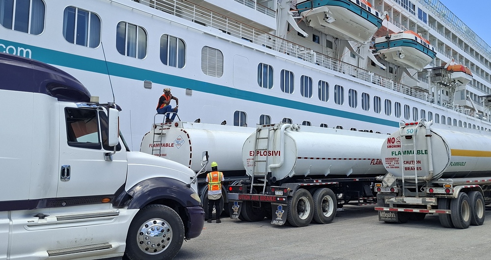 Laut Kapitän Hansen wurden heute 550 Tonnen Sprit gebunkert, das entspricht, da ein Liter Diesel 0,85 Kilo wiegt, 647.000 Liter. Für diese Aktion waren also circa 25 LKWs notwendig.