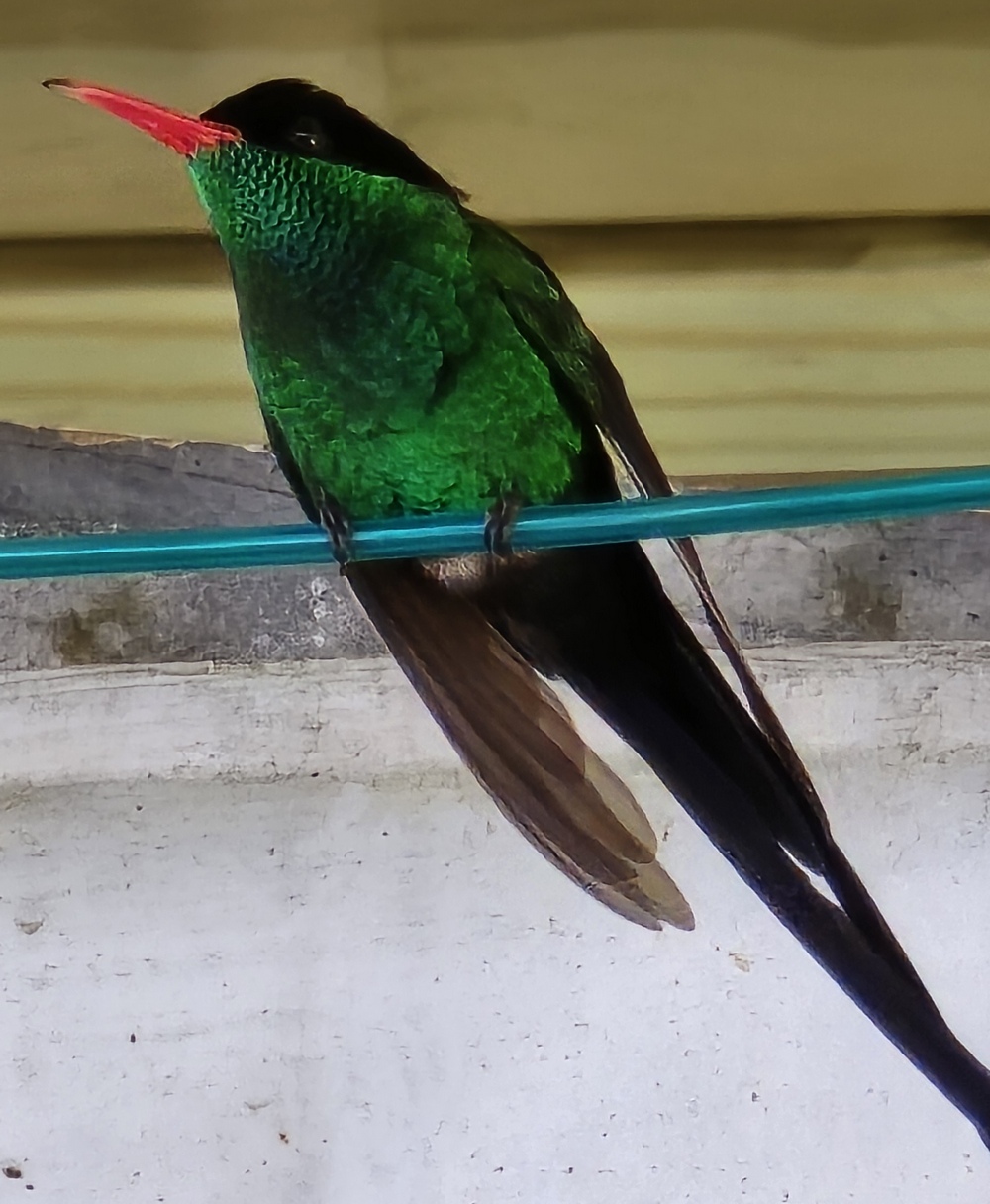 Diese spezielle endemische Art des Kolibris gibt es nur hier auf Jamaica und wird „Doctor Bird“ genannt. Die offizielle Bezeichnung lautet Red-billed Streamertail (Trochilus polytmus)