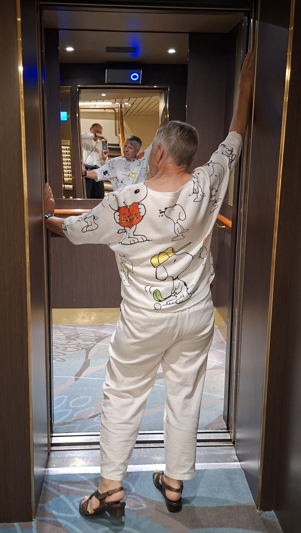 Doris wollte von Deck 4 auf Deck 8 fahren und von einem Aufzug stand auch schon die Tür offen.