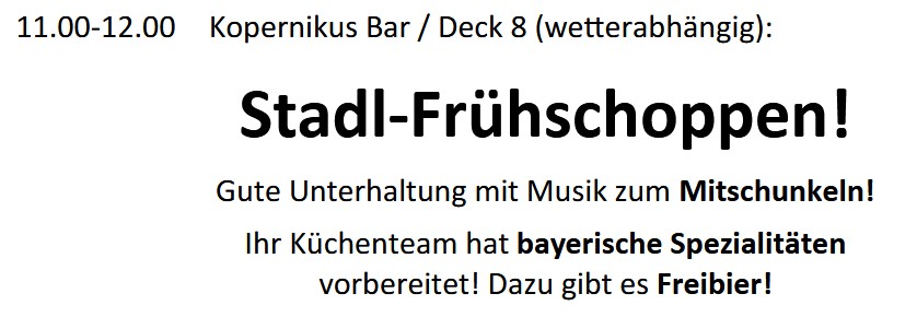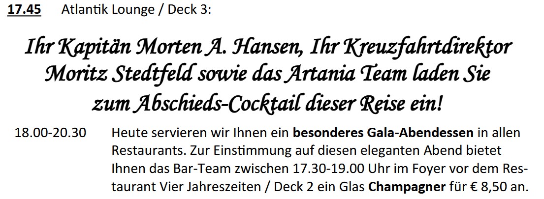 Die üppige Osterdeko und die Fülle an gefärbten Ostereiern an den Buffets und auf den Tischen der Restaurants war heute nur noch in Ansätzen vorhanden und zum Abendessen war Ostern auf der ARTANIA deko-mäßig bereits Geschichte.