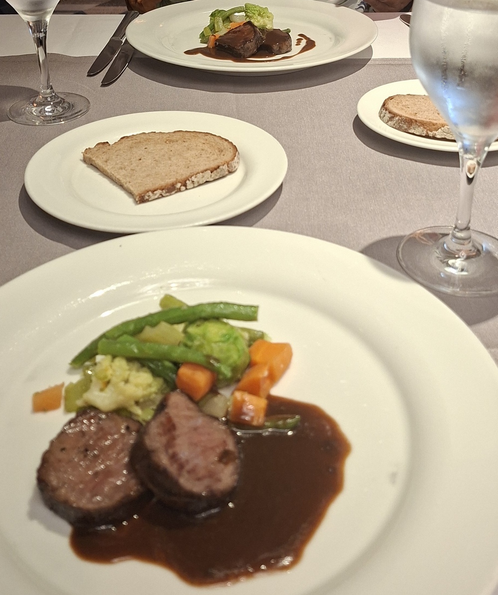 Da unsere Steaks noch von „medium“ auf „medium well“ nachbearbeitet wurden, konnten wir sie nicht gleich vom Buffet mitnehmen. Deshalb wurden unsere Teller erst etwas später vom Koch an unseren Tisch gebracht.