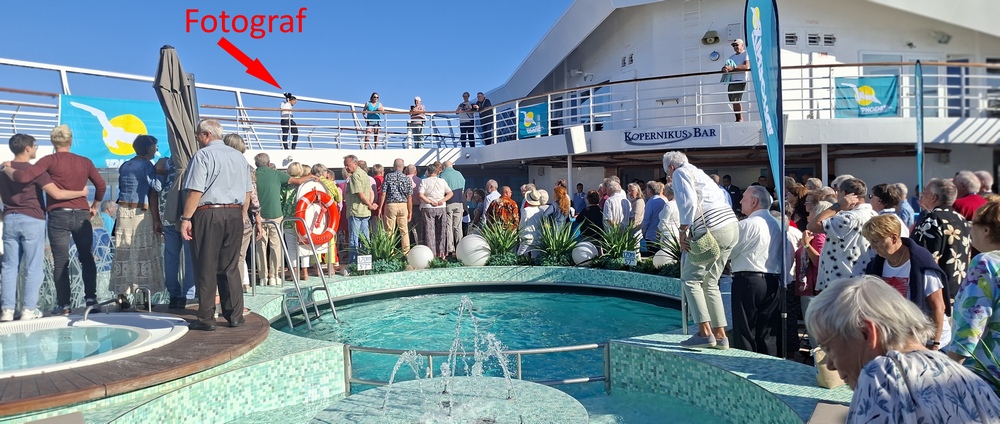 Am Nachmittag fand an der Kopernikus-Bar ein Fotoshooting statt, zu dem auch wir geladen waren. Mit den knapp 200 Passagieren, die die gesamte Amerika-Reise absolvierten, sollte ein Gruppenfoto angefertigt werden.