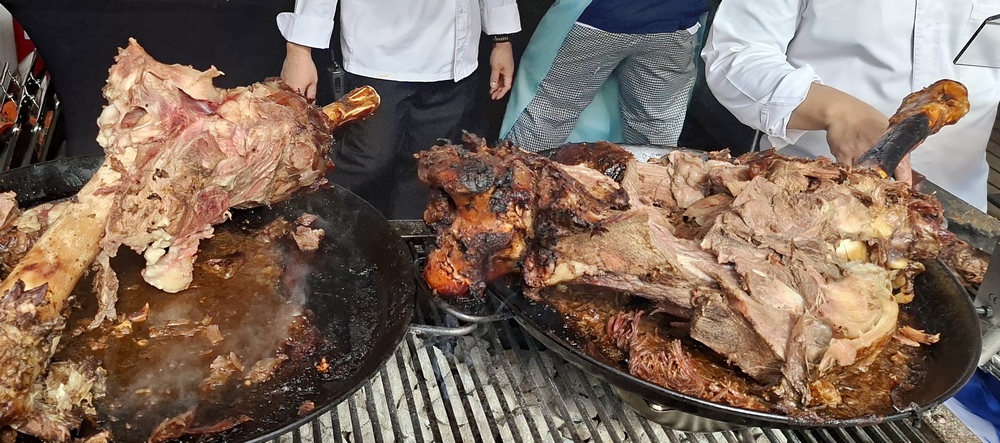 Das Küchenteam serviert in der Kopernikus-Bar „Im Ganzen gebratene Argentinische Rinderkeule“. Als wir viertel nach eins zum Mittagessen schreiten, ist die Keule schon arg abgenagt. 😊