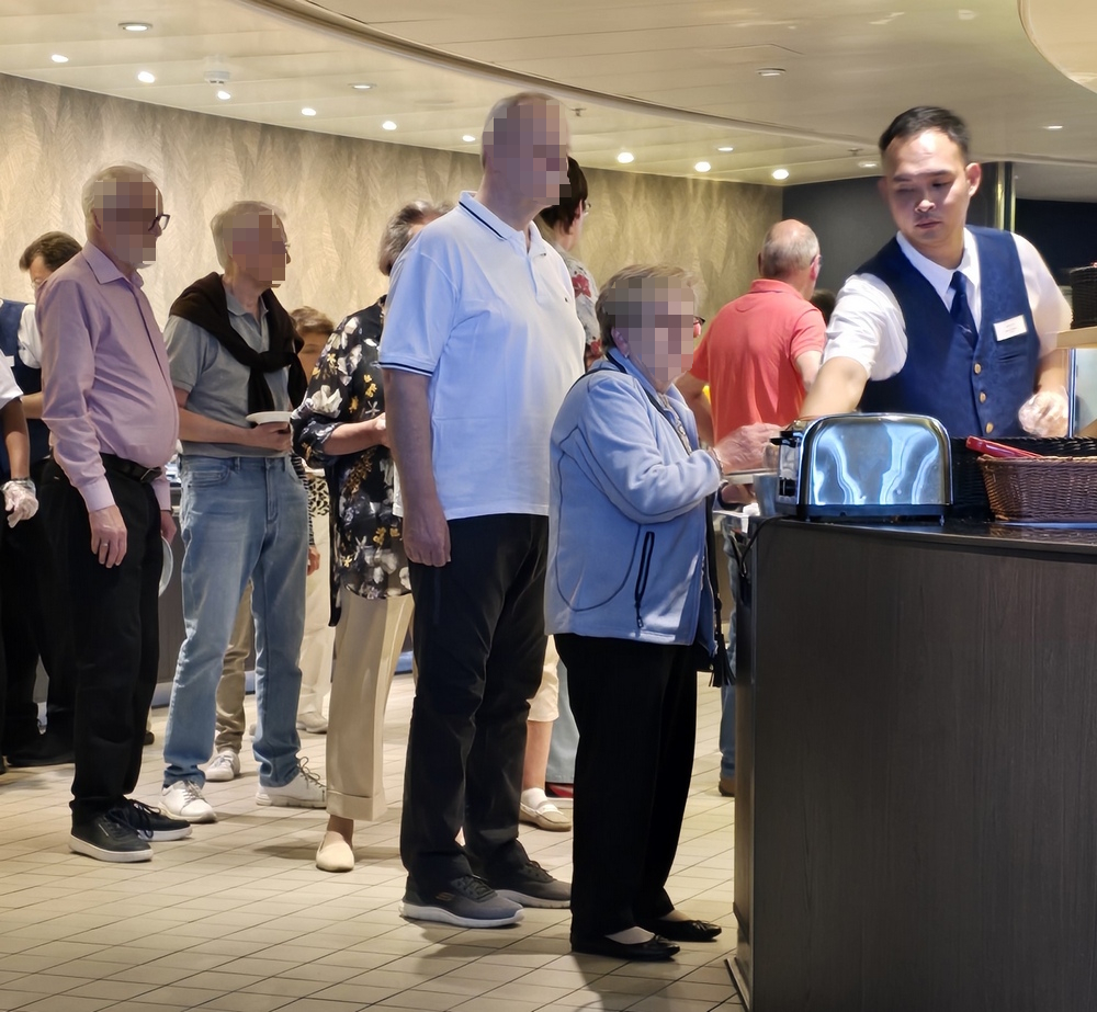 Aber Umrundung hin und Umrundung her, es war halb neun und alle Passagiere, die eben noch die Außendecks bevölkert hatten, strömten jetzt gleichzeitig zum Frühstück.