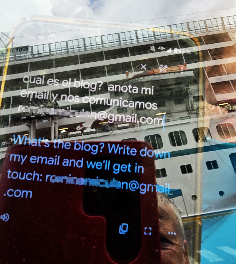Pünktlich um 10:15 Uhr holte uns Rodrigo, unser Fahrer, am Hafenausgang ab. Die Kontaktaufnahme war einfach. Doris hatte ihm vorab ein Foto von uns mit den auffälligen gelb-blaue Jacken geschickt. So erkannte er uns schon von Weitem.