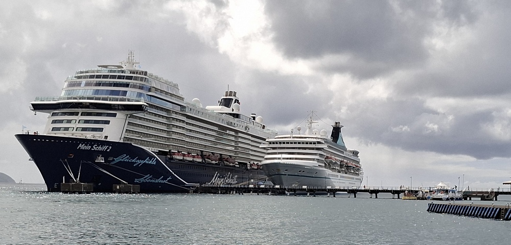 Als wir am Morgen um 8:00 an der Pier von Fort-de-France festmachten, lagen wir im Schatten der sehr viel größeren Mein Schiff 2 (2.900 Passagiere)