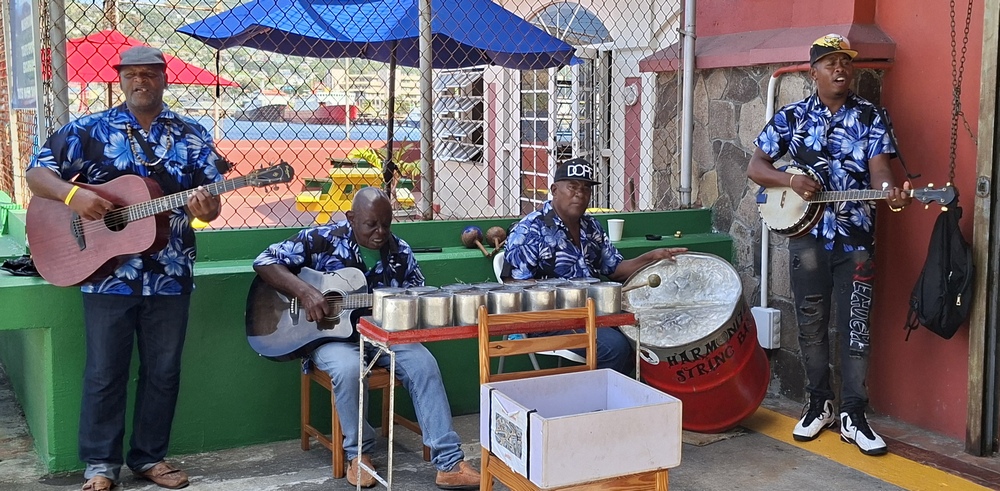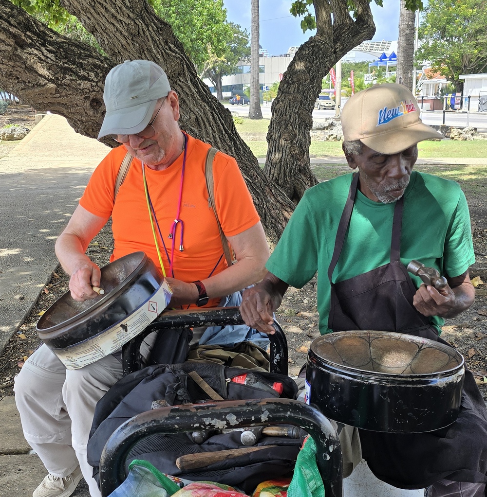 Aber ein Einheimischer an der Uferpromenade erregte allerdings unsere Neugier. Mit einem Hammer „stimmte“ er eine Steel-Drum, ein Instrument, das aus Metallfässern hergestellt wird. Bereitwillig demonstrierte er uns auf einem schon fertigen Instrument, wie es gespielt wird. Er forderte mich auf, es auch einmal zu versuchen.