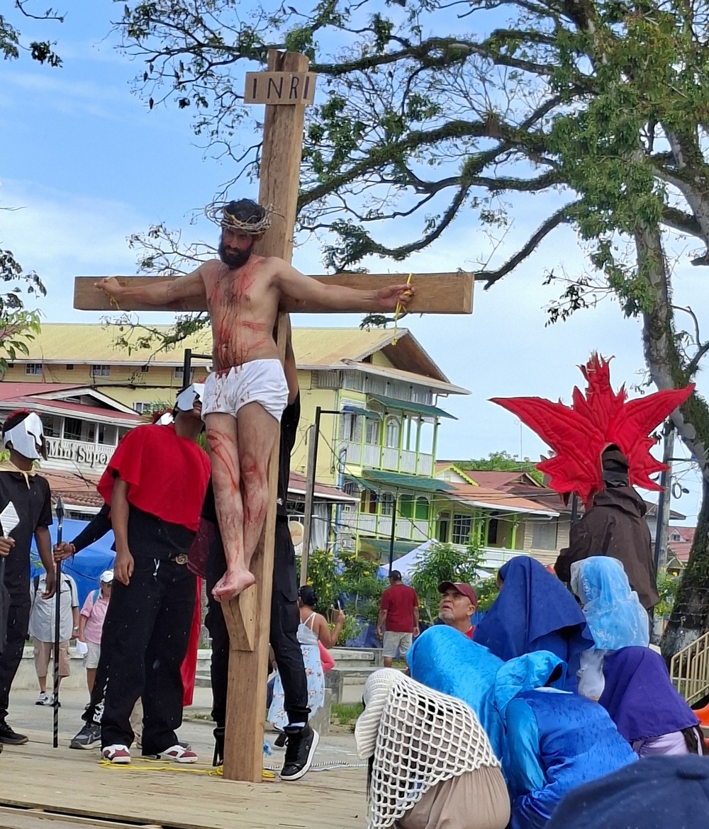 Die Kapelle führte eine Karfreitagsprozession an mit einem recht realistischen Jesus, der sein Kreuz zu tragen hatte.